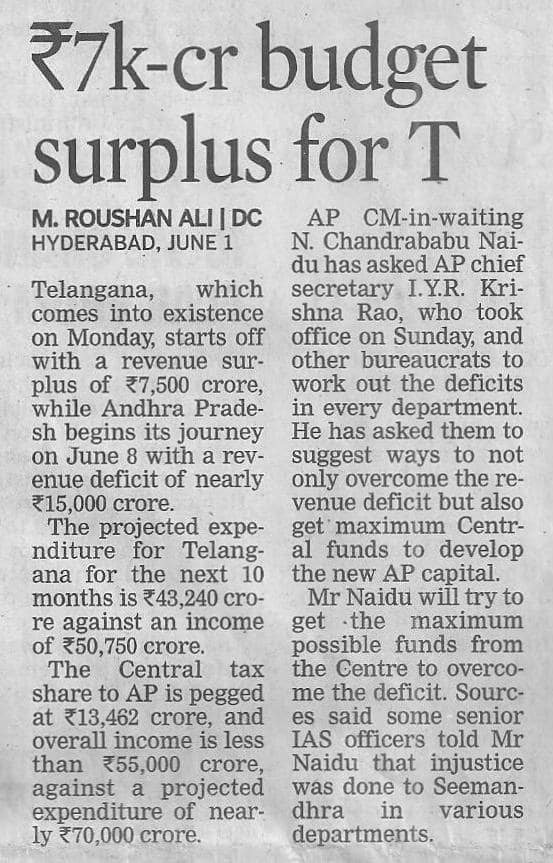 - Rs.7K cr budget surplus for T – Deccan Chronicle , 02-06-2014.