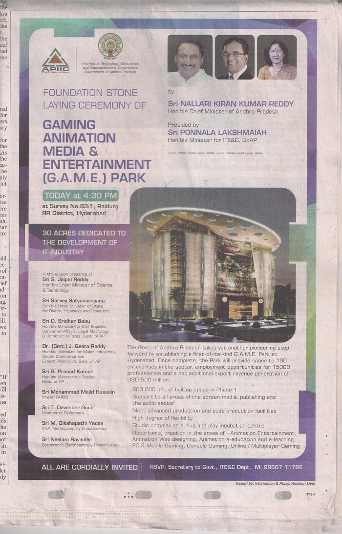 - Ad Gaming Park at Raidurgam – Deccan Chronicle, 08-01-14