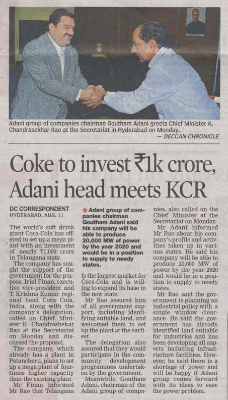 - Coke to invest Rs. 1K crore,Adani head meets KCR – Deccan Chronicle, 12.08.2014.