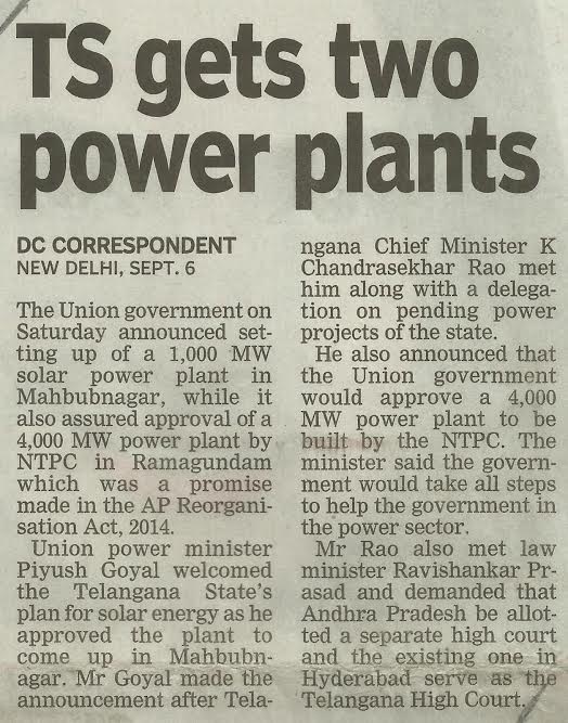 - TS gets two power plants – Deccan Chronicle, 07-09-2014.