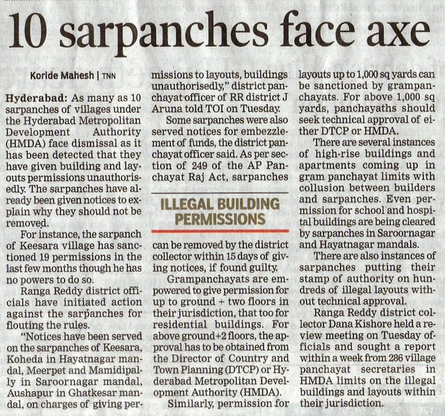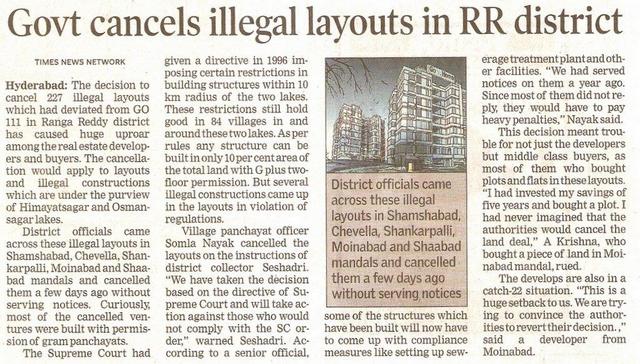 - Govt cancels illegal layouts in RR district – Times of India, 7.12.2011