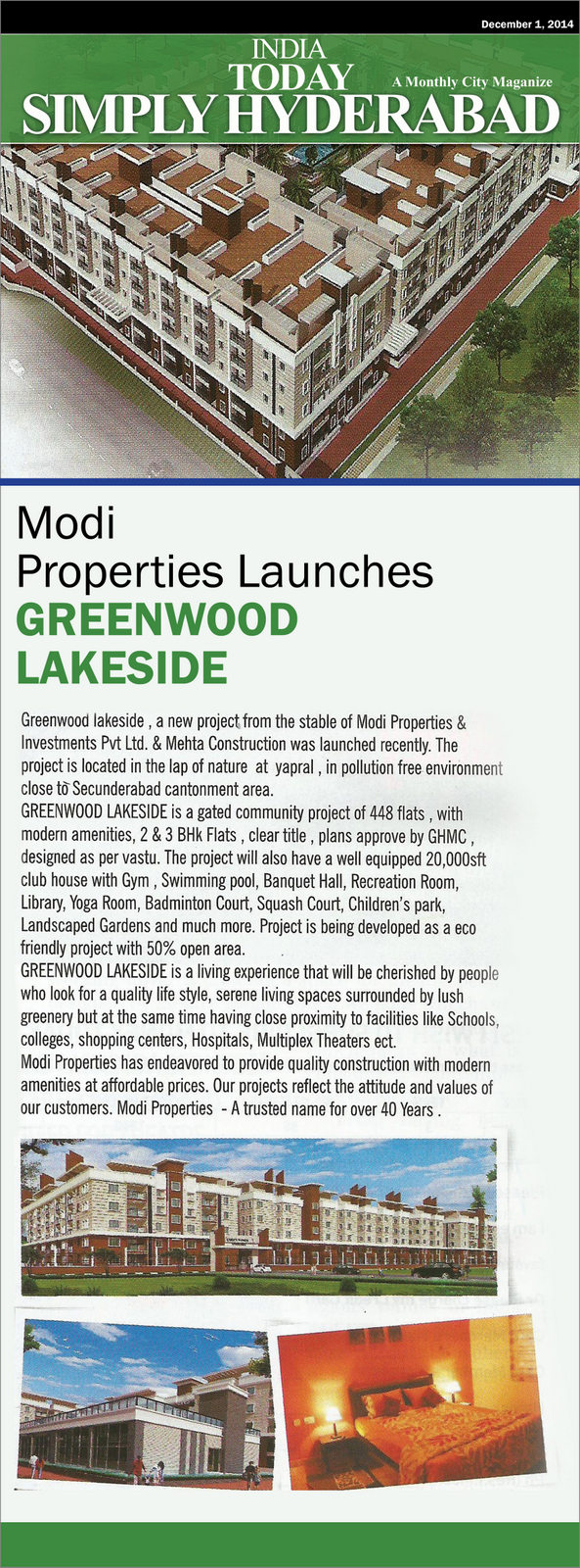 - Simply Hyderabad, Modi Properties Launches Greenwood Lakeside – India Today A Monthly City Magazine, 1.12.2014