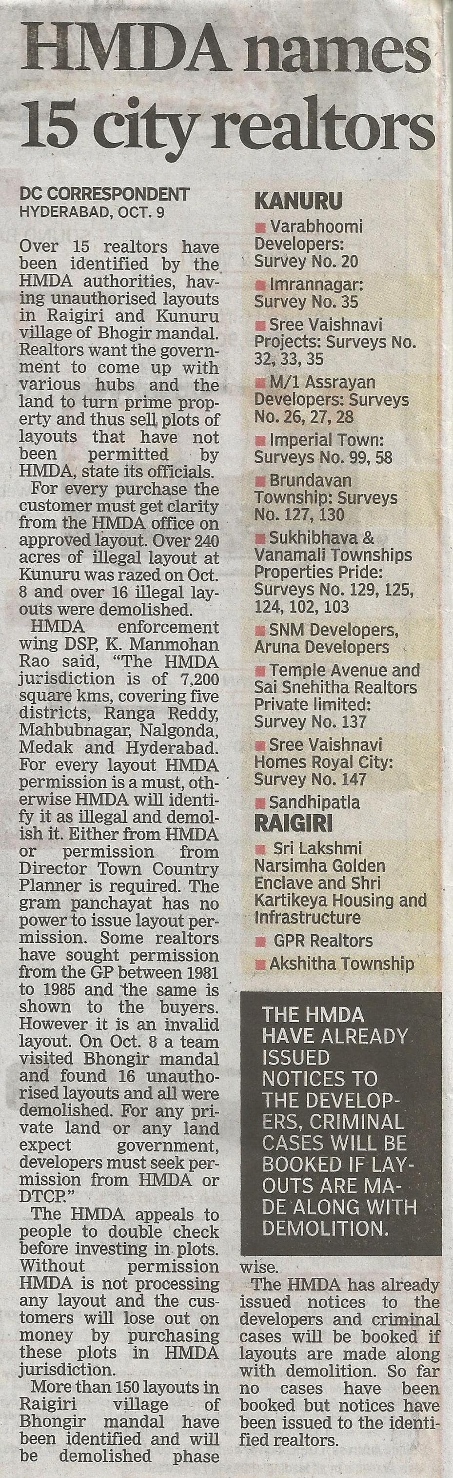 - HMDA names 15 city realtors – Deccan Chronicle,10-10-2015