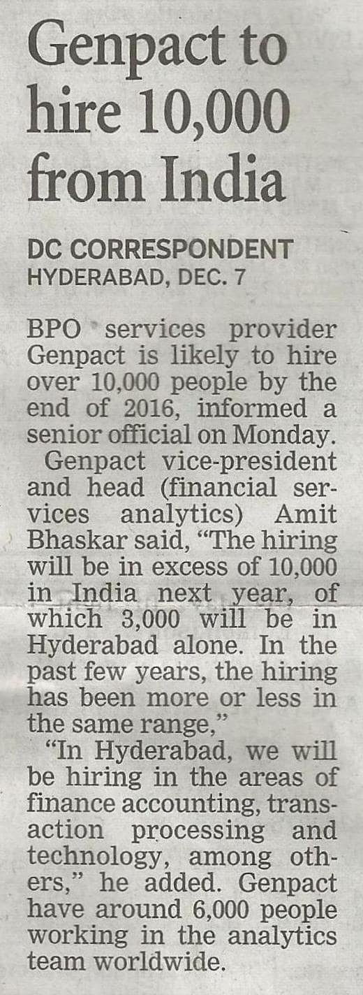 - Genpact to hire 10000 from India – Deccan Chronicle 8-12-2015.