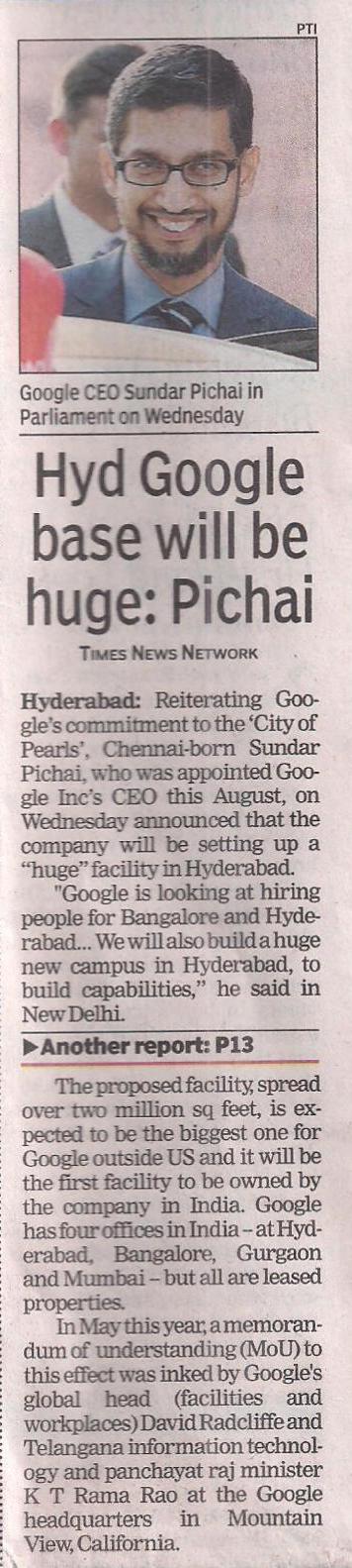 - Hyd Google base will be huge Pichai – Times of India 17-12-2015