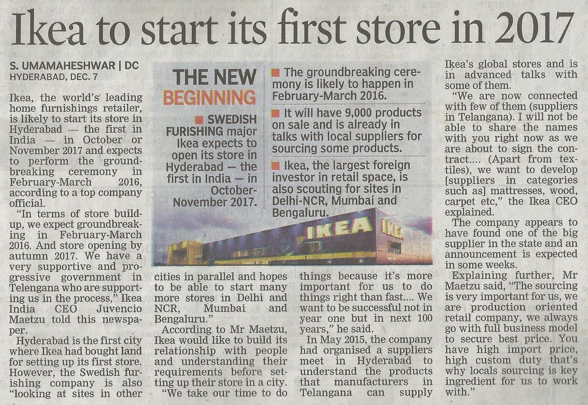 - Ikea to start its first store in 2017 – Deccan Chronicle, 8-12-2015.
