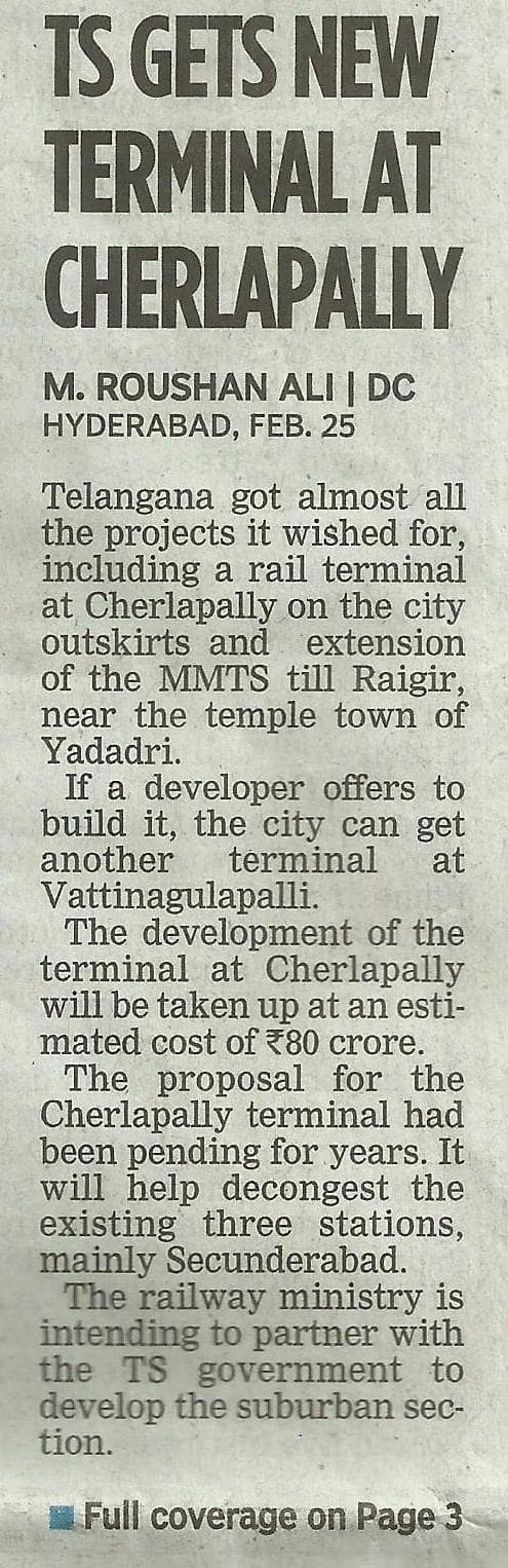 - TS gets new terminal at Cherlapally – Deccan Chronicle, 26-2-2016